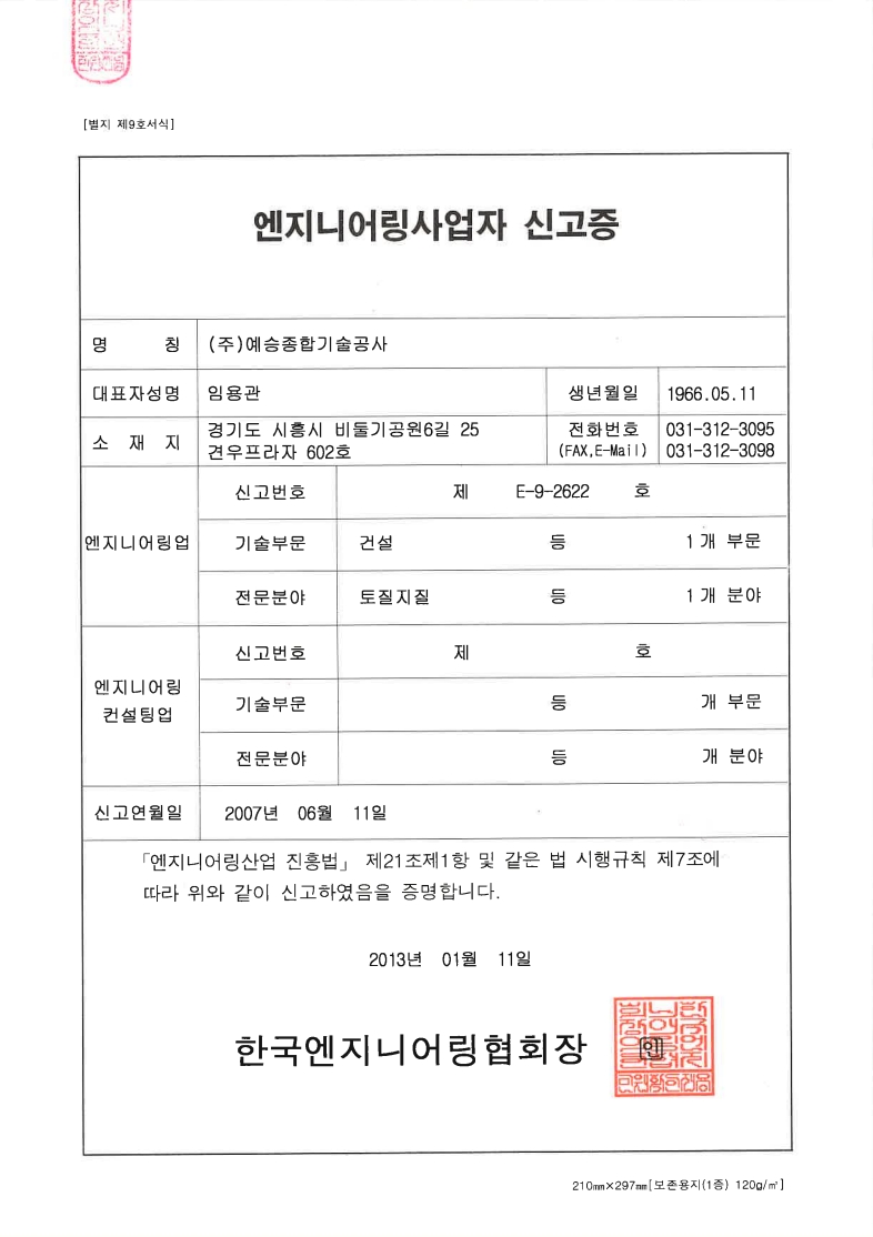 주식회사 예승종합기술공사 | 대표자 : 임용관 | 사업자등록번호 : 215-81-86759